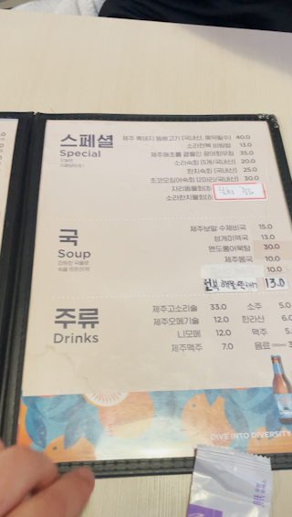 메뉴도 제주도에서 먹는 음식들 위주로 되어있어요